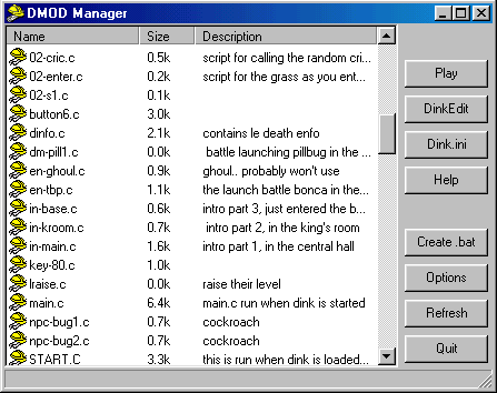 Good: The readme.txt explains clearly what this programme is about and how to install it. You can direct the location of a help file, so you can easily look into that one without having to browse through the explorer. You can start DinkEdit and play the D-mod from the same programme. You can add an editor of .c files and an editor for the dink.ini. Behind the main.c and various start*.c files there is a description of every file. You can work at more then one D-mod at the same time. You can even make this programme start up automatically when Windows is loaded.