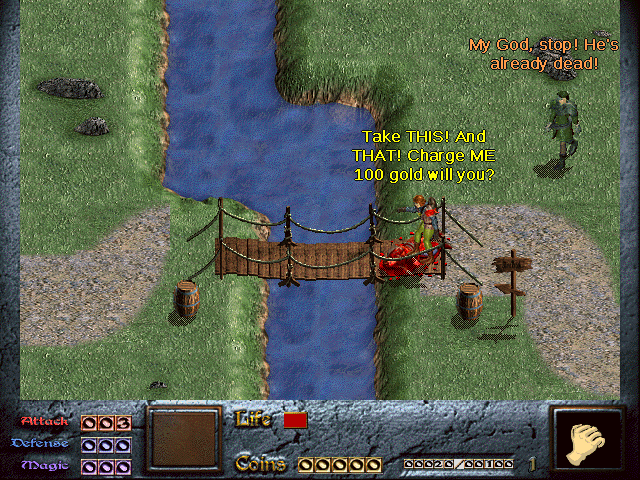 Not far into the game, I encounter what I think must be a serious bug. You see, there's this complete jerk who wants to swindle people out of 100 gold in order to let them cross a bridge that is clearly public property. So I do what we do to jerks - punch them until they either stop being jerks, or simply stop being - and this happens. Clearly, this can't be right. donkeys are not supposed to be invincible, especially not donkeys standing on bridges that clearly don't belong to them.