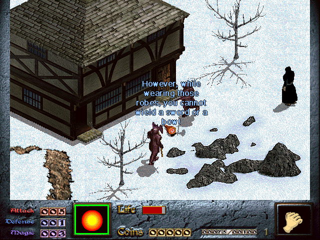 Anyway, Dink does find a bit of treasure. He shrewdly locates a health increase, and steals a megapotion from an unwitting giant pillbug. He also found a "magic potion" somewhere, whatever THAT does. Only once, though, does he get any closer to his goal, robbing 200 gold from an abandoned looking house.
