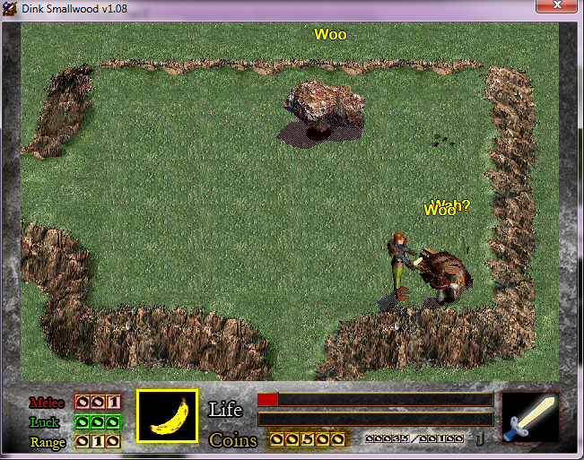 I updated my scripts to say stuff when Dink hits them (barrels say "Wah?", mushrooms say "Woo"). Dink just hit a sprite or two next to where he's at with his fancy light sword, but it also triggered a hit on a mushroom hidden behind a rock at the top.